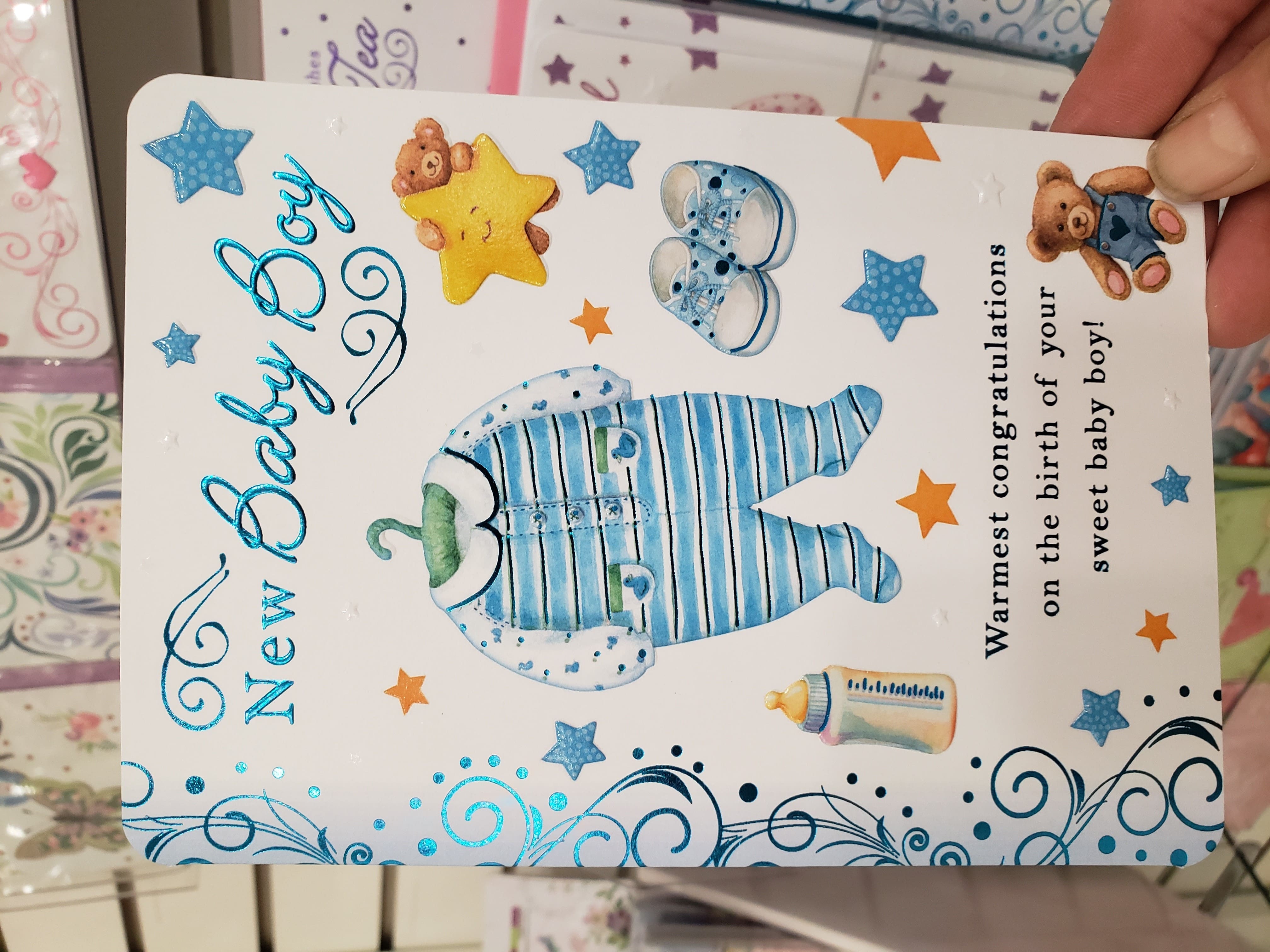 5″ x 7″ cards with colour coordinated envelope in a protective cello sleeve. Inside: Congratulations on the safe arrival of your new baby boy!