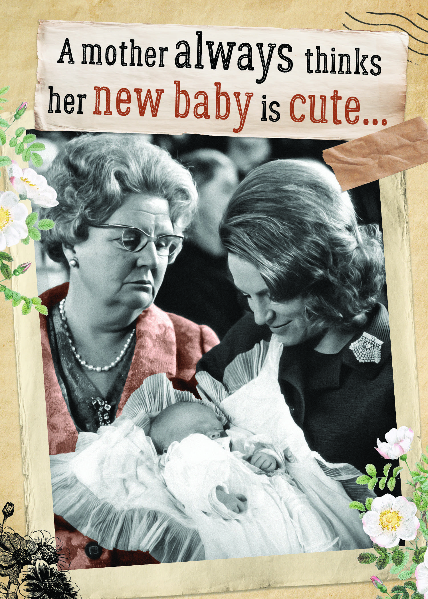 5 x7″ Card with Kraft Envelope. INSIDE: Luckily, you have a true cutie on your hands. Congratulations. Printed in Canada