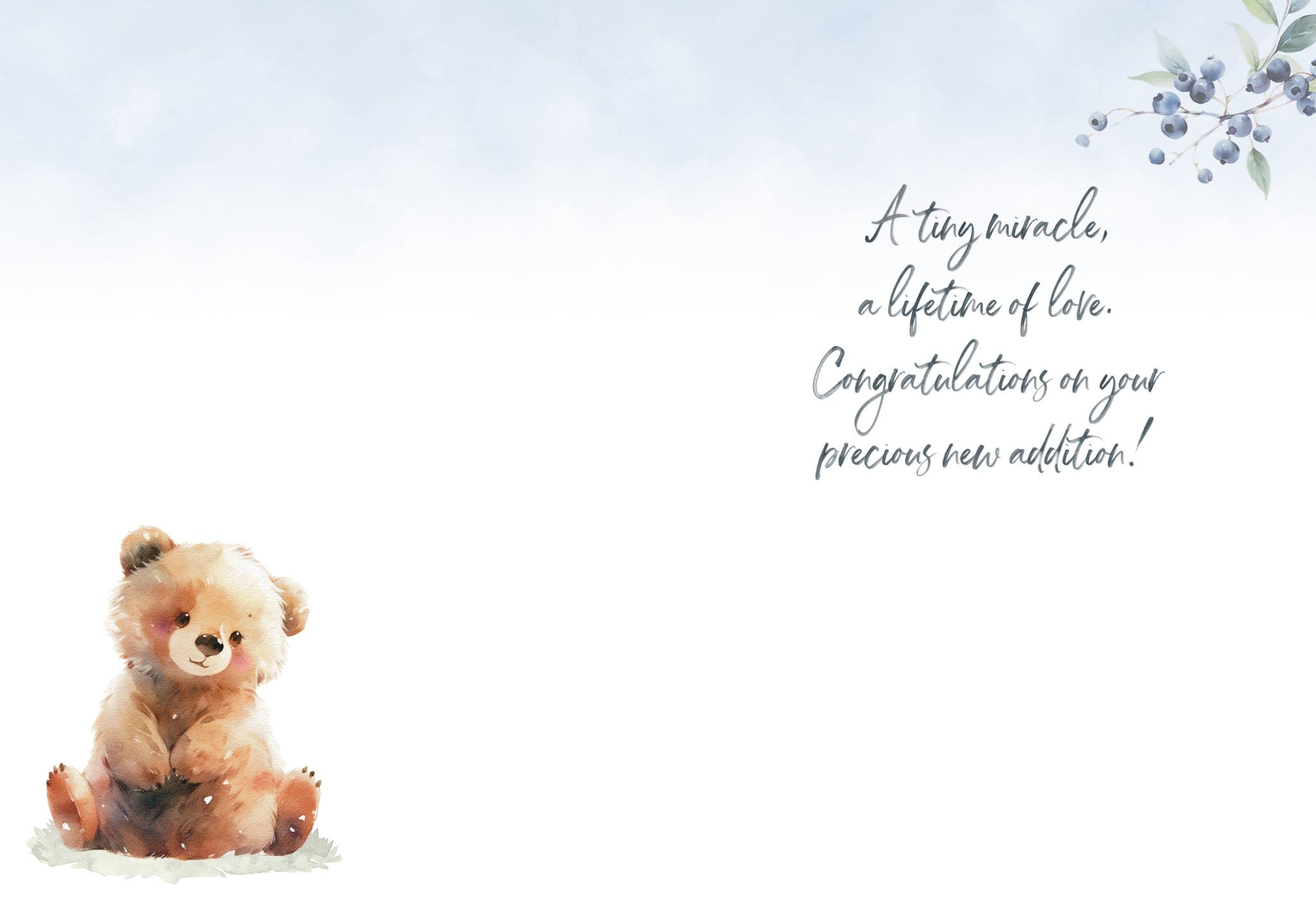 Full size card measuring 5×7″ is printed in Canada with full colour on the interior & exterior. Each card includes an envelope and wrapped in cellophane. INSIDE: A tiny miracle, a lifetime of love. Congratulations on your precious new addition!