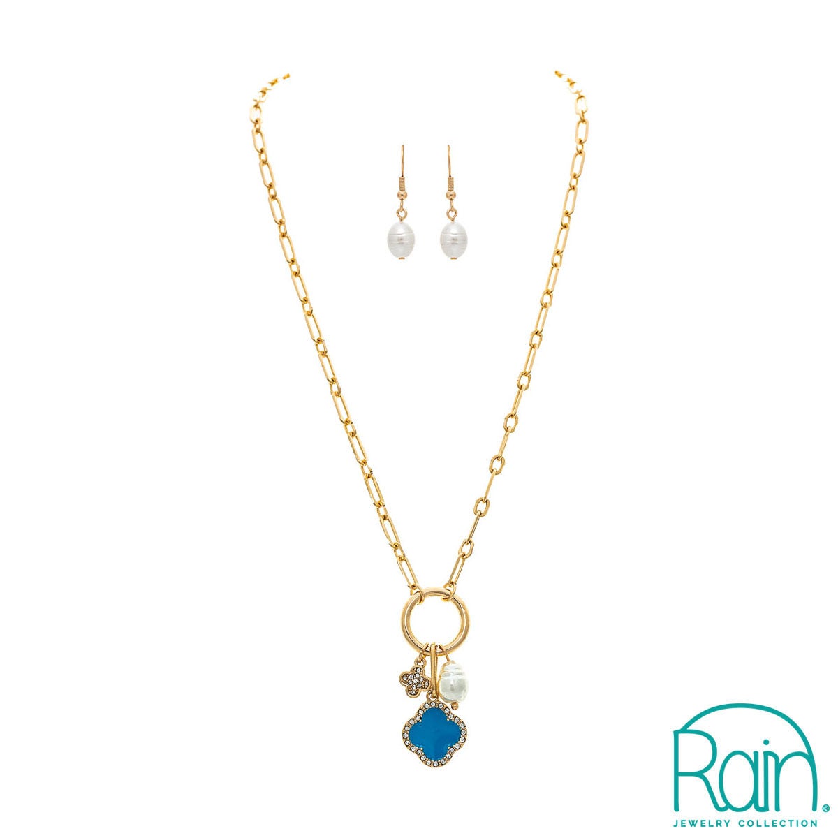 Product materials may include zinc, brass and steel with silver and rhodium plating. Lead safe. Includes necklace and matching earrings.