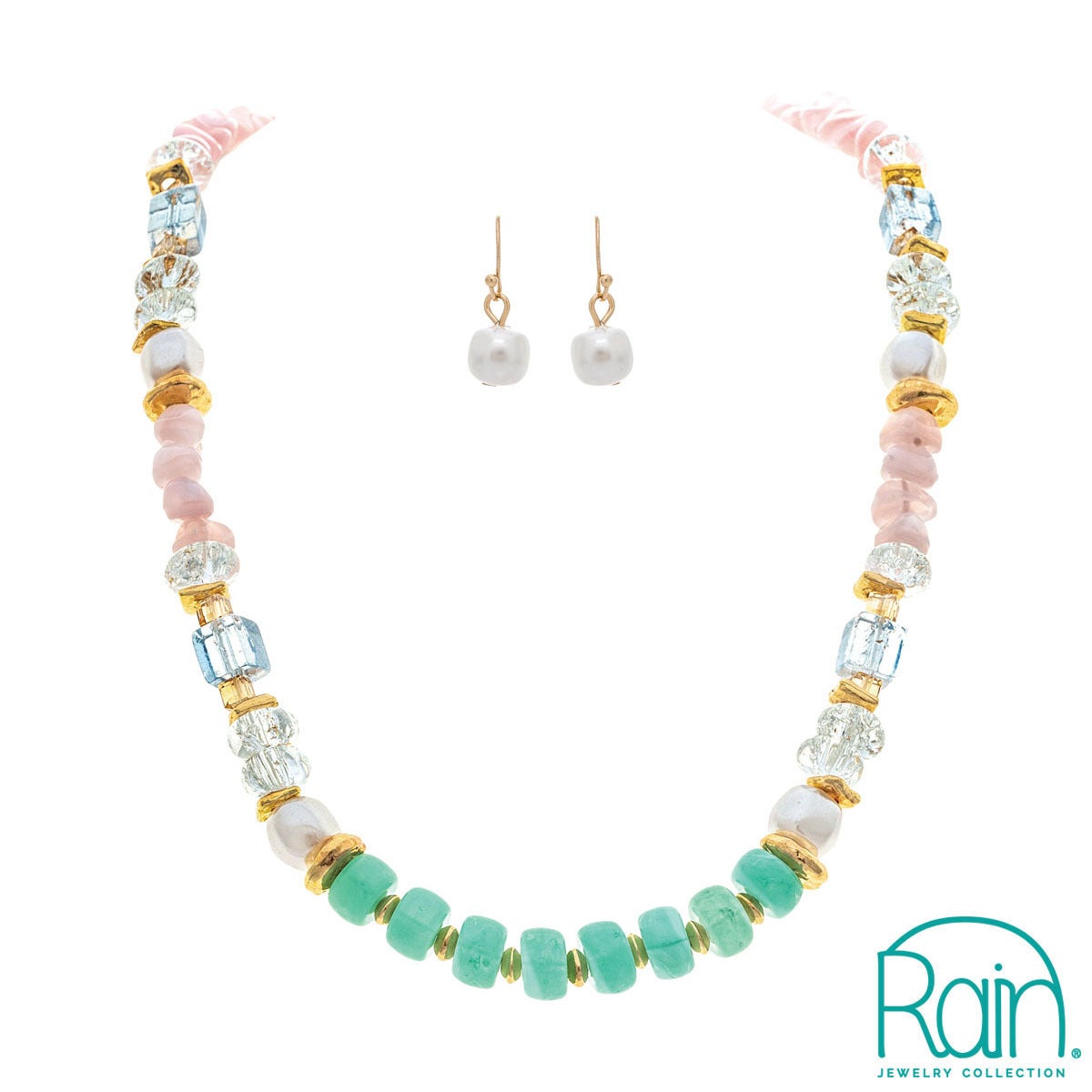 Product materials may include zinc, brass and steel with silver and rhodium plating. Lead safe. Includes necklace and matching earrings.