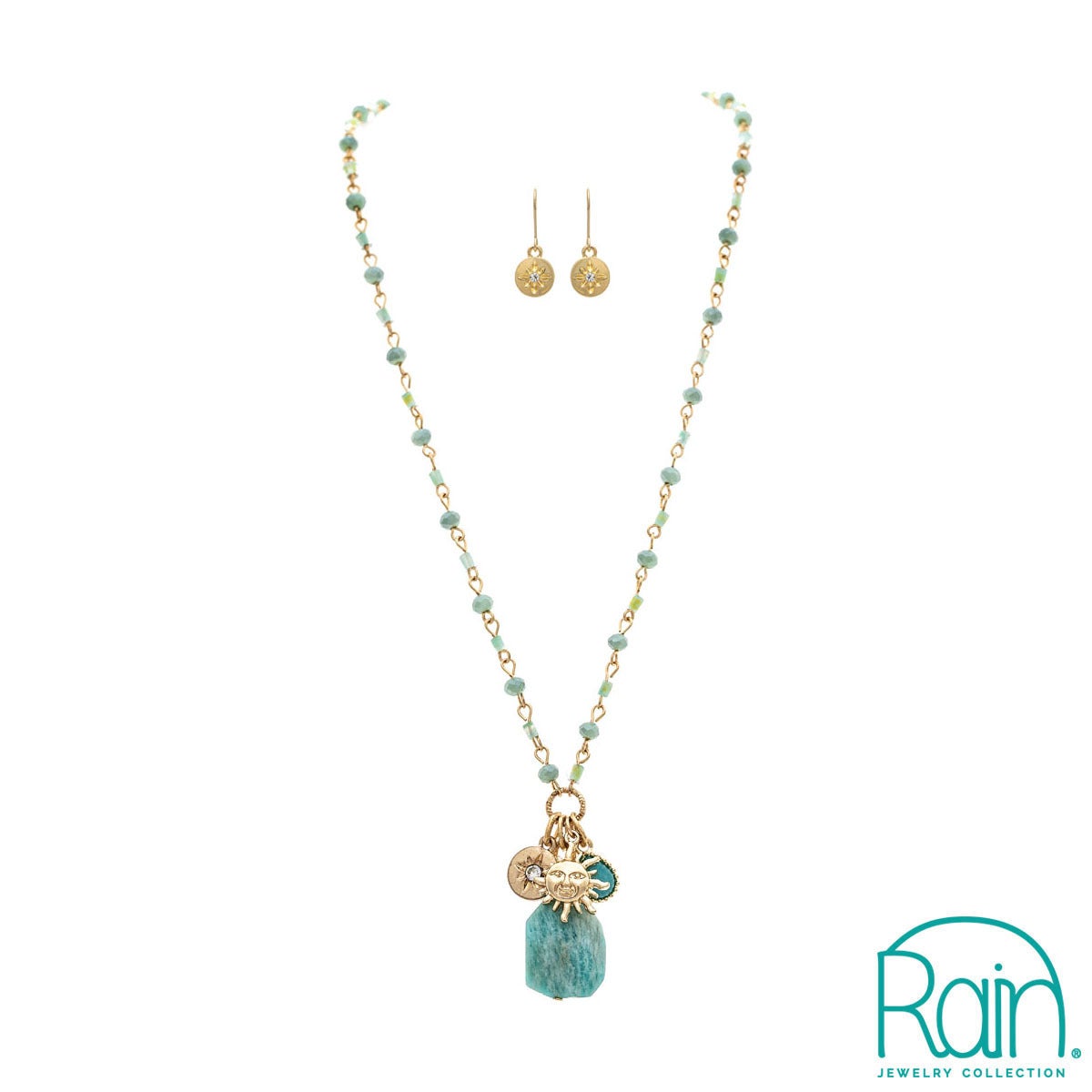 Product materials may include zinc, brass and steel with silver and rhodium plating. Lead safe. Includes necklace and matching earrings.