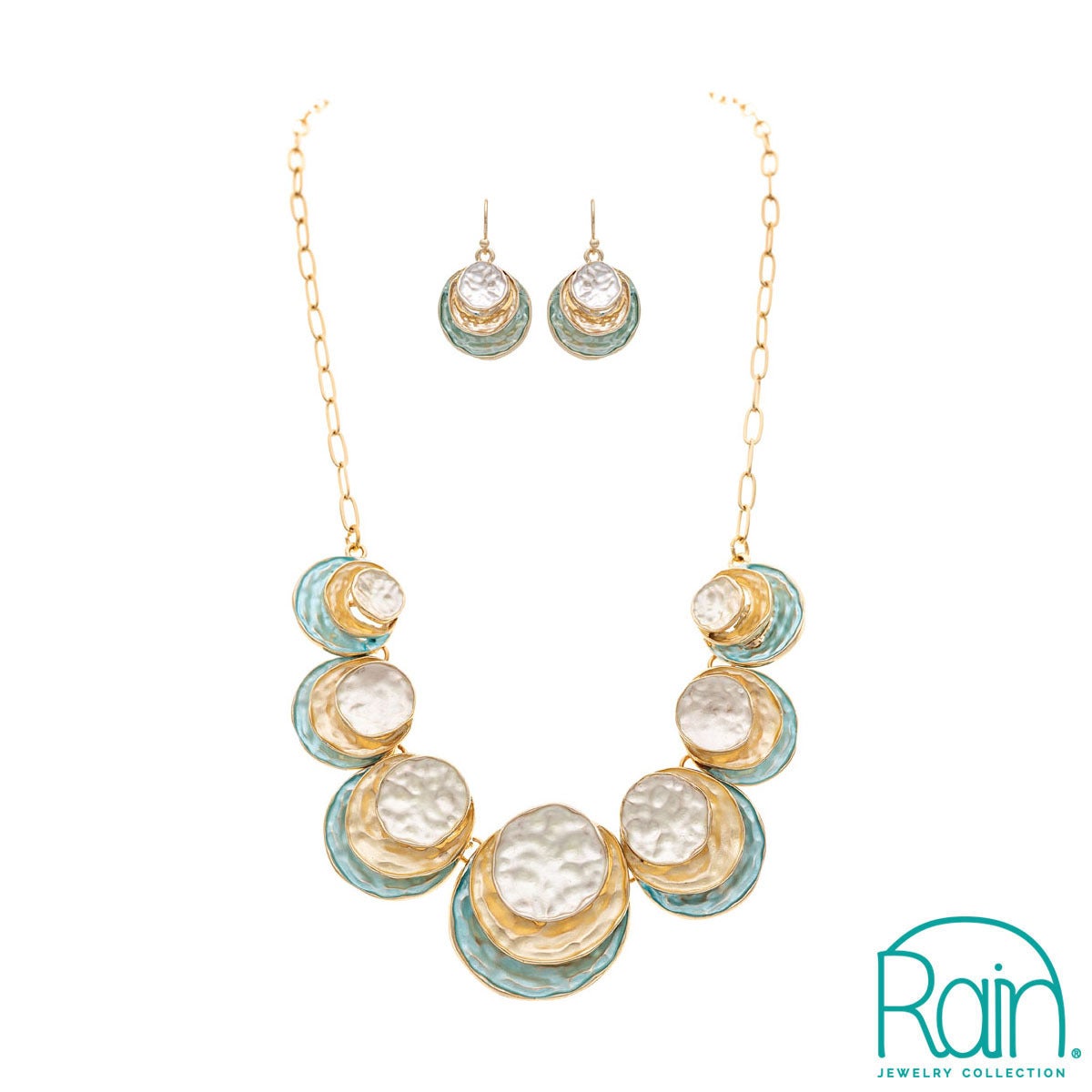 Product materials may include zinc, brass and steel with silver and rhodium plating. Lead safe. Includes necklace and matching earrings.