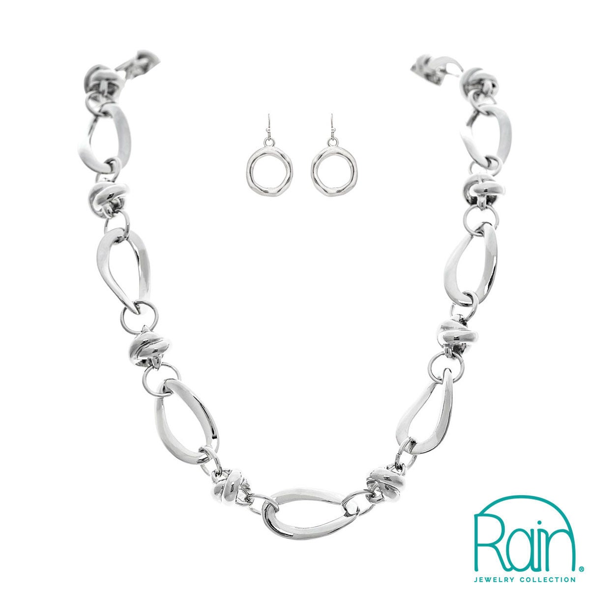 Product materials may include zinc, brass and steel with silver and rhodium plating. Lead safe. Includes necklace and matching earrings.
