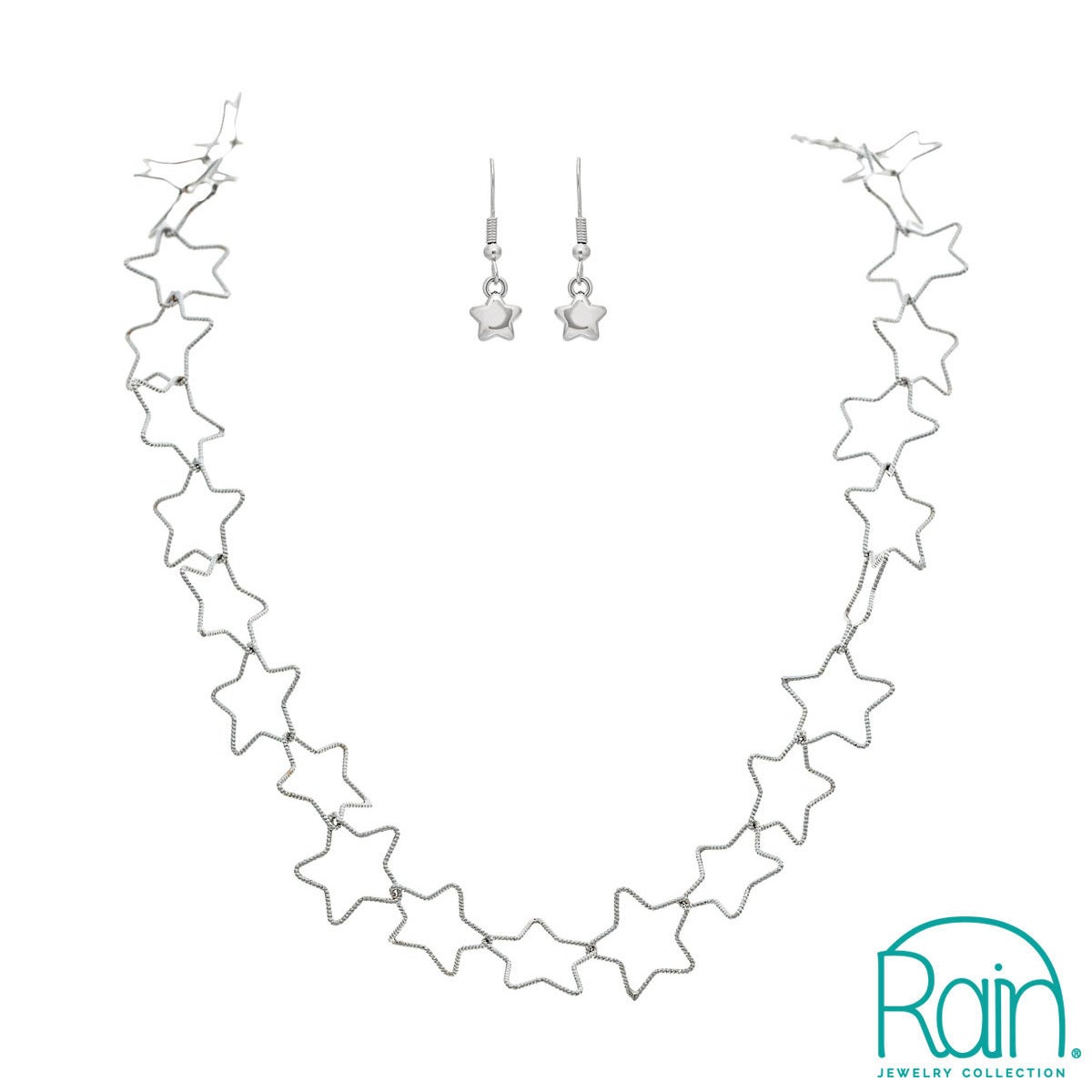 Product materials may include zinc, brass and steel with silver and rhodium plating. Lead safe. Includes necklace and matching earrings.