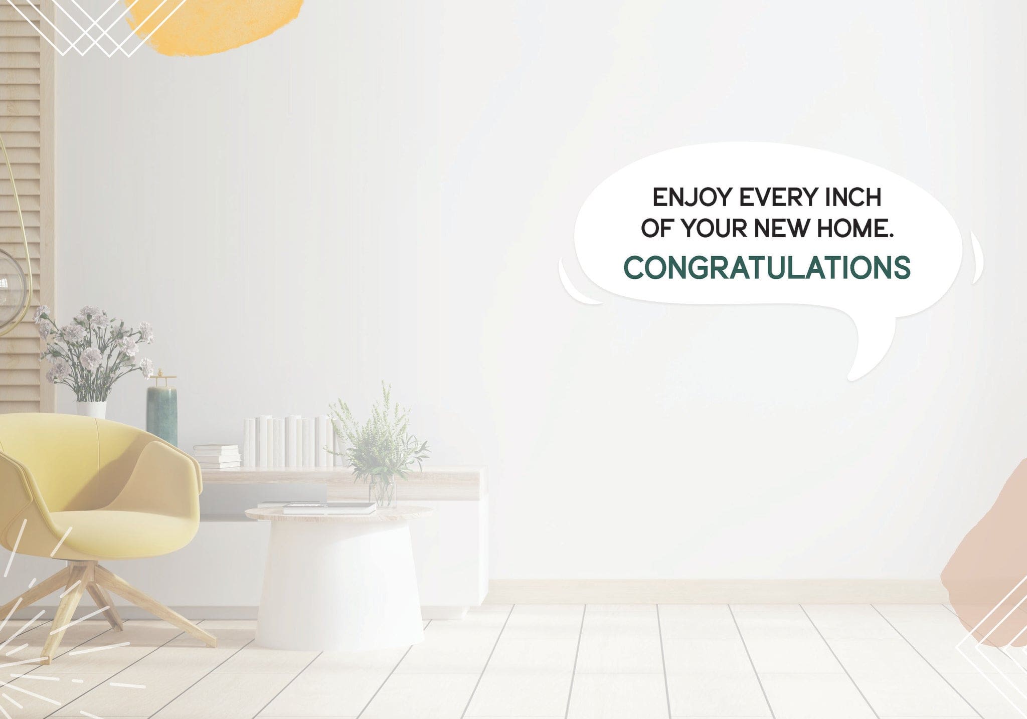 Each card measures 5″x7″ (13cmx18cm) and is printed in full colour on coated paper, comes with a coordinating colour envelope. Printed in Canada. Inside greeting: Enjoy every inch of your new home. Congratulations