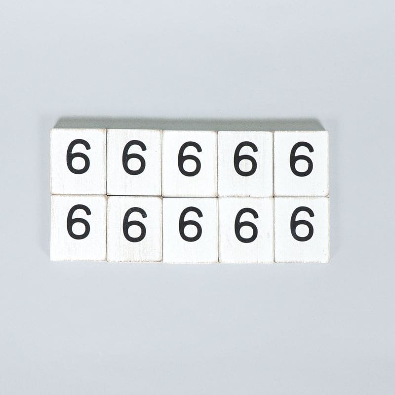 Set of 10 wood number “6” tiles, measuring 1.5″x 1.75″x 0.25″ each. White with Black lettering.