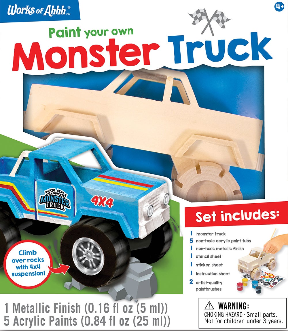 Wood Craft & Paint Kit includes 1 wood monster truck, 1 sticker sheet, 1 stencil sheet, 1 non-toxic metallic finish, 5 non-toxic acrylic paint tubs, 2 artist-quality paintbrushes, and 1 instruction sheet with painting guide.
