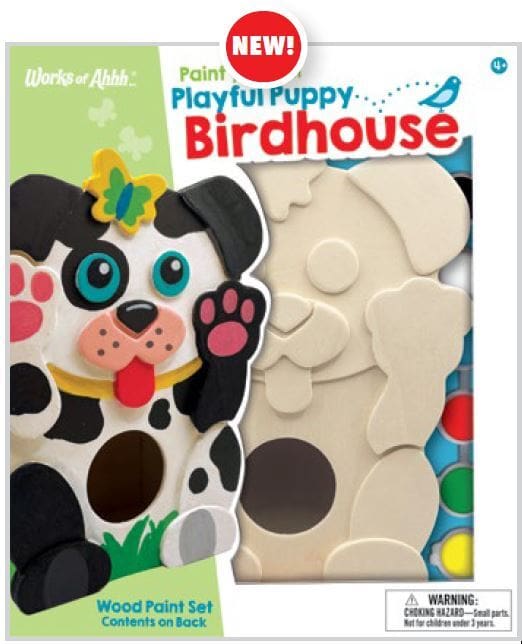 Wood Craft & Paint Kit includes 5 acrylic paints, varnish, 2 paintbrushes, 6 sheets of tissue paper, 16 gems, pair of googly eyes. Instructions to help with painting and assembling as well as color mixing and advanced painting techniques. Kids 4+