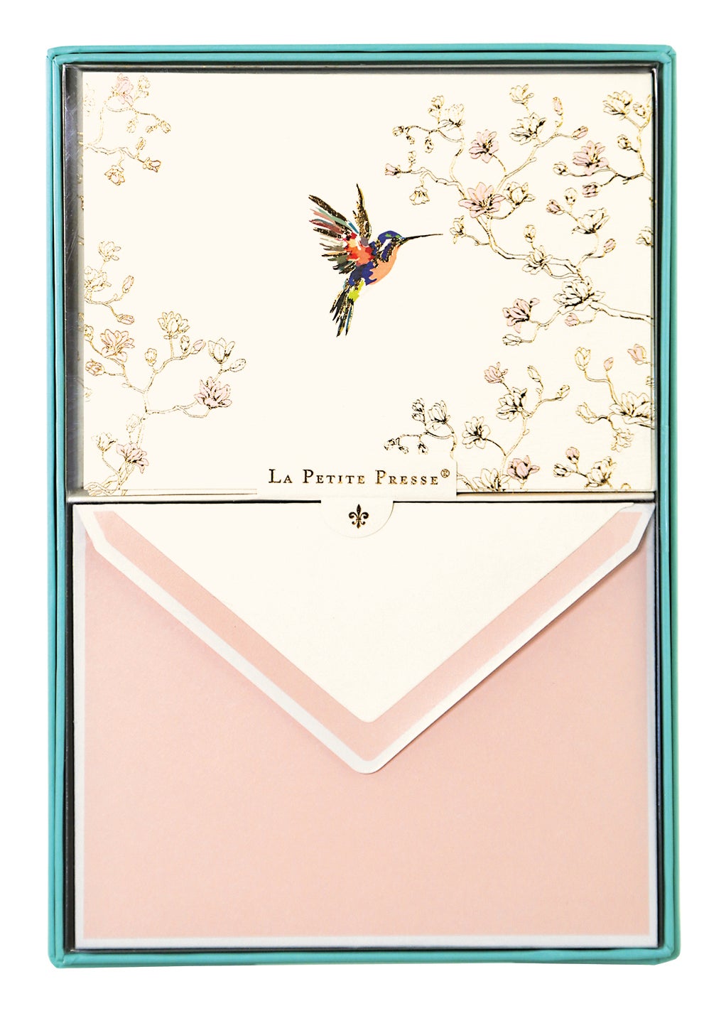10 Folded Cards and Envelopes, Textured Cream Paper. Packaged in wrapped box with acetate cover. Card size 5.25″ x 3.8″