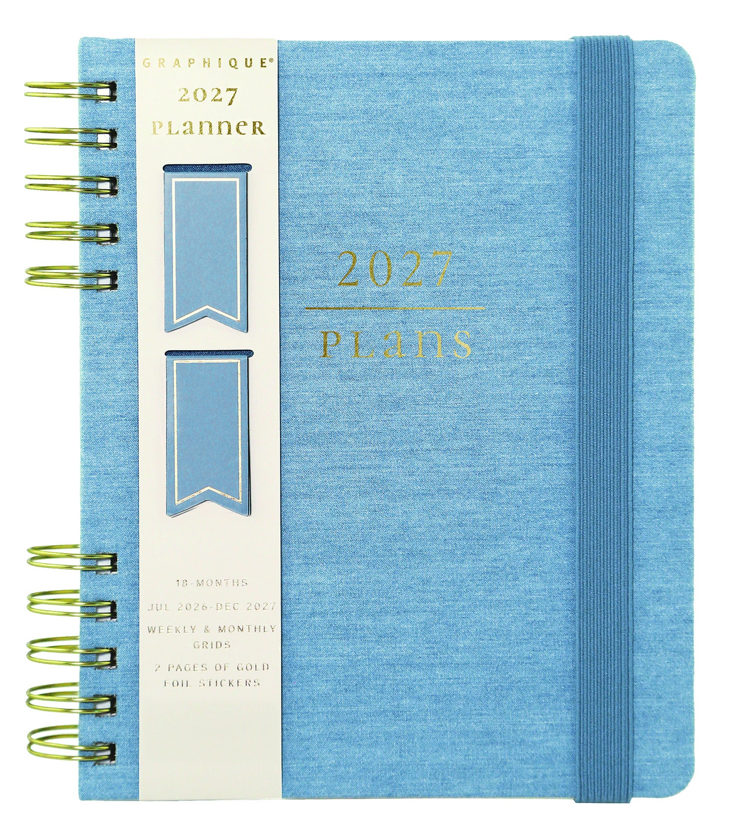 18-Month planner measures 6″ x 8″ with weekly and monthly grids, elastic closure and pen loop. Soft vegan leather cover. Will start shipping in August 2026
