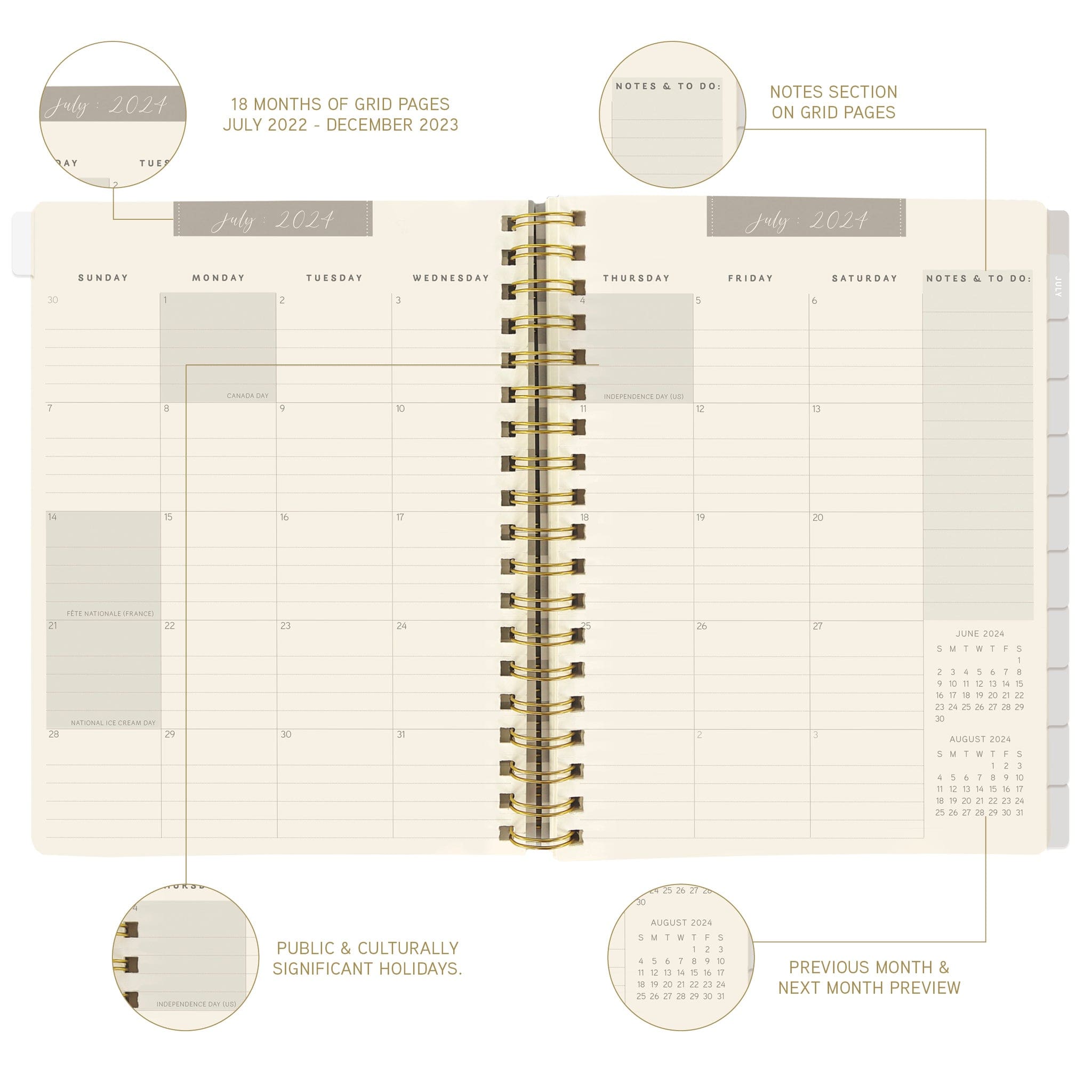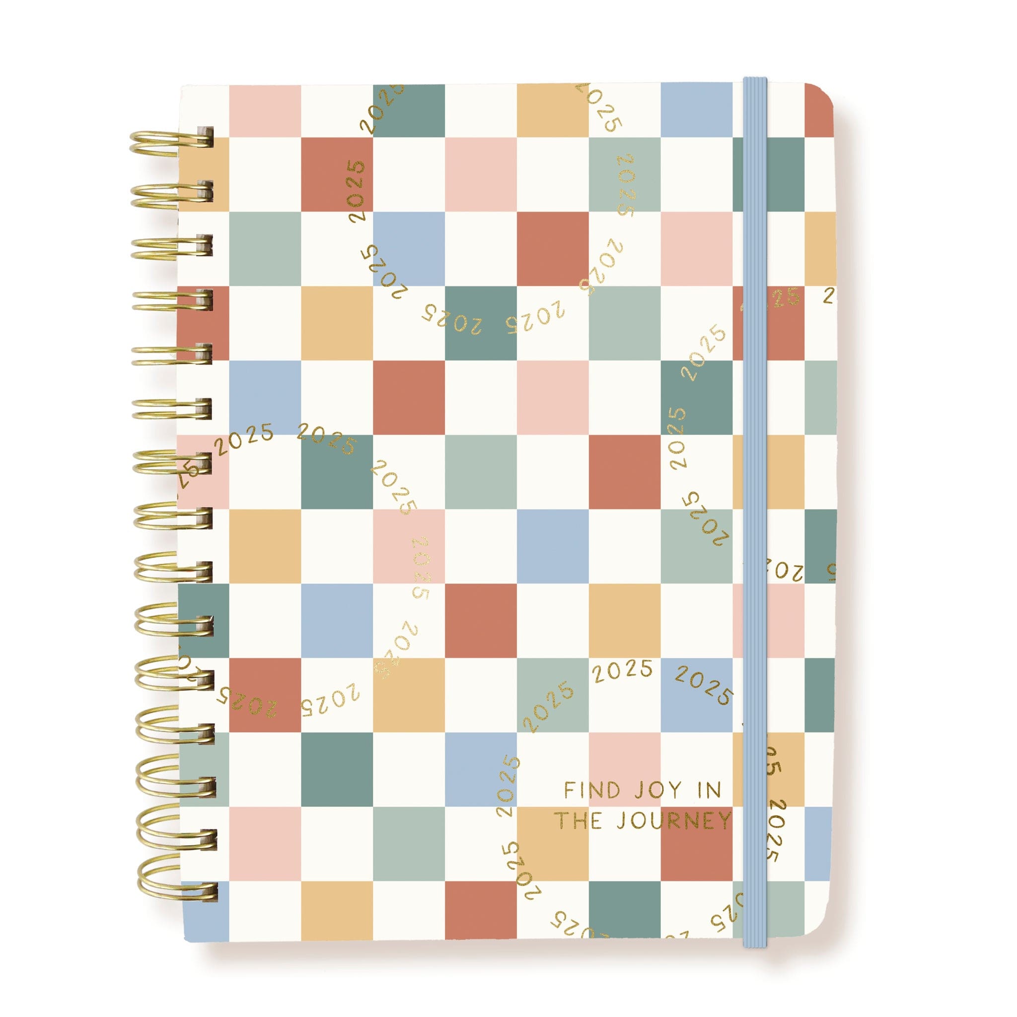 18-Month planner measures 8″ x 10″ with weekly & monthly grids, laminated tabs and hardbound cover with elastic.
