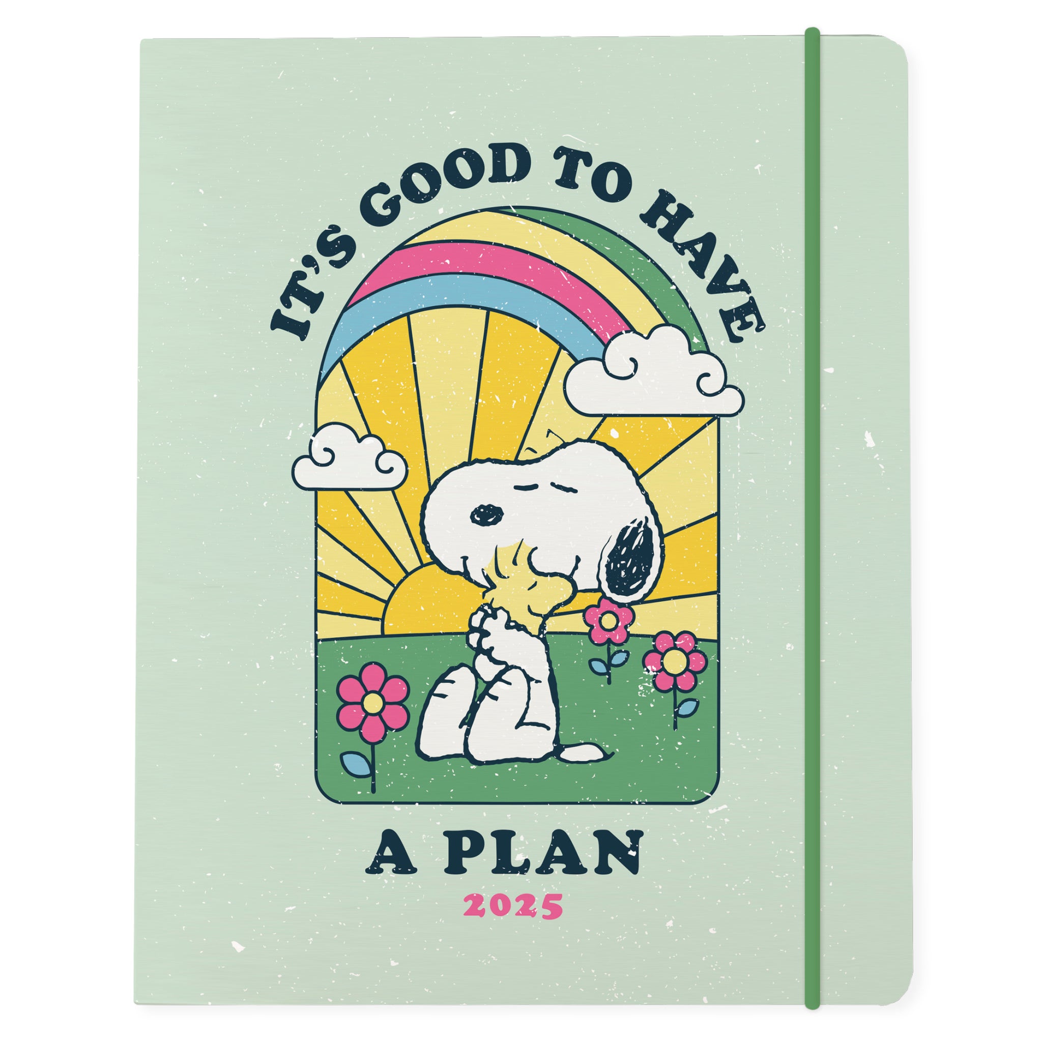 18-Month planner measures 8″ x 10″ with monthly grids, stitched binding and double thick paper cover with elastic.