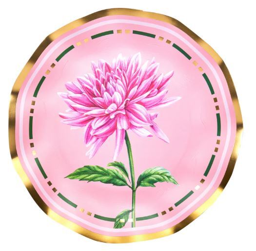 Elevate your dining experience with the Dahlia Garden 8″ Paper Plate, featuring a stunning dahlia bloom design in soft pink hues accented with a stunning gold metallic trim. Includes 8 plates per pack.