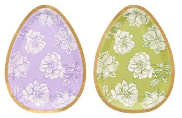 8.5″ egg-shapped salad plates feature delicate vintage florals and are accented with shimmering gold foil. Includes 8 plates per pack.