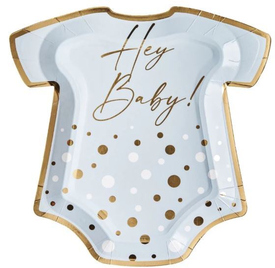 A perfect 8″ die-cut plate in the shape of a baby onesie in baby blue color. Includes 8 plates per pack.