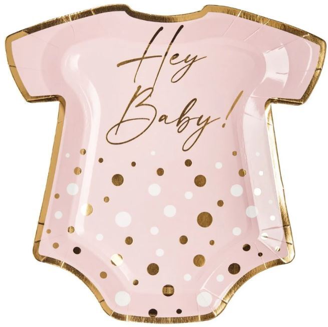 A perfect 8″ die-cut plate in the shape of a baby onesie in baby pink color. Includes 8 plates per pack.