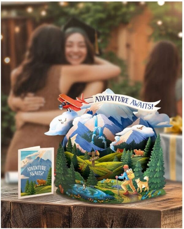 Mark a milestone with the spirit of wanderlust! This delightful display is the perfect gift for anyone who enjoys the great outdoors or is headed on their next big adventure! Includes envelope, pop-up bouquet and blank notecard. Measures 10″ x 9″.
