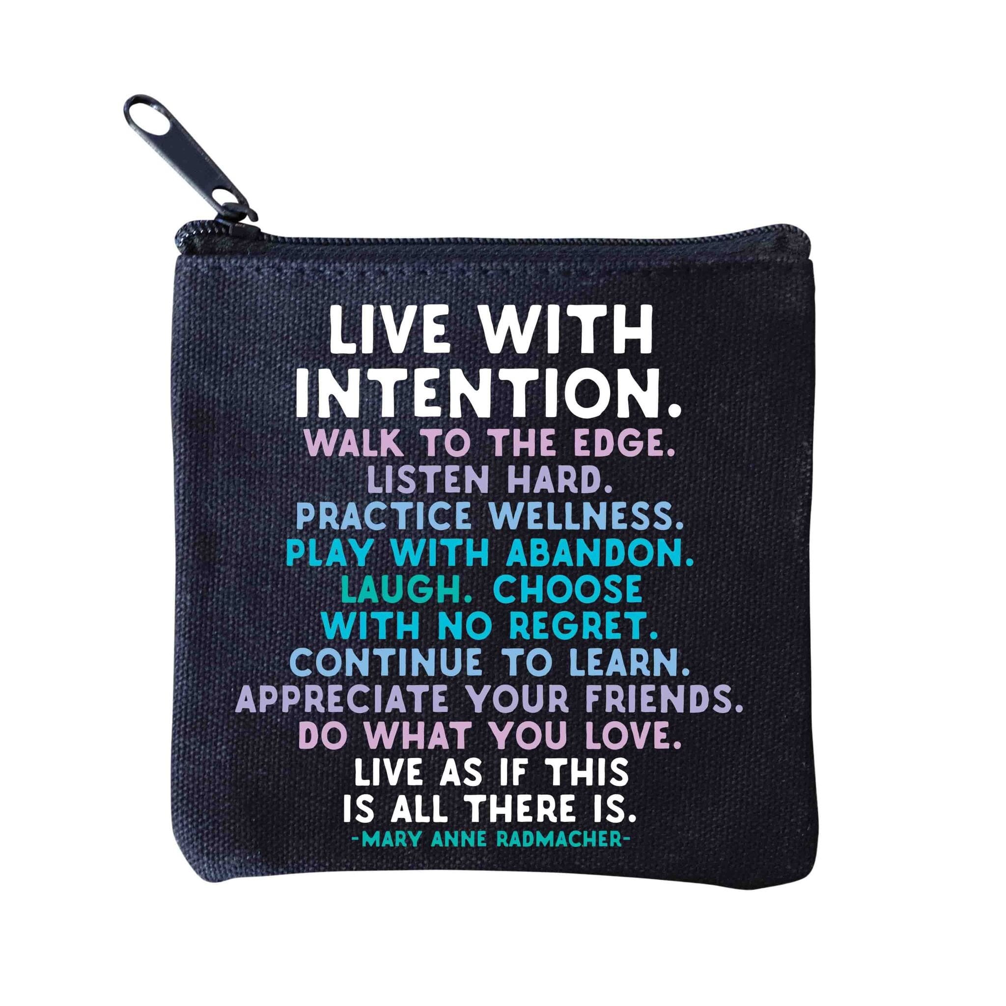 4 1/4″ square pouch 100% cotton canvas. live with intention. walk to the edge. listen hard. practice wellness. play with abandon. laugh. choose with no regret. continue to learn. appreciate your friends. do what you love. live as if this