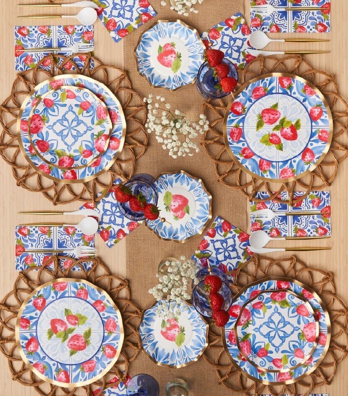 Includes full Bleu Strawberries paper collection (12 cocktail napkins, 12 guest napkins, 12 appetizer bowls, 12 salad plates, 12 dinner plates). No display included.
