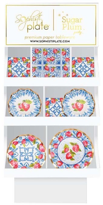 Includes full Bleu Strawberries paper collection (24 cocktail napkins, 12 guest napkins, 16 appetizer bowls, 18 salad plates, 20 dinner plates) and corrugated cardboard display. Display measures 51″ x 21.75″.