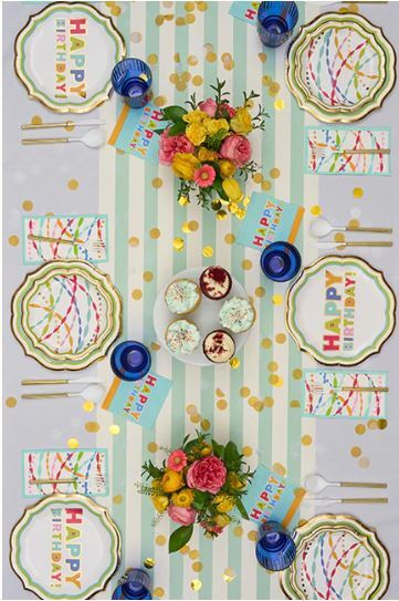 Includes full Bright Birthday paper collection (12 cocktail napkins, 12 guest napkins, 12 salad plates, 12 dinner plates). No display included.