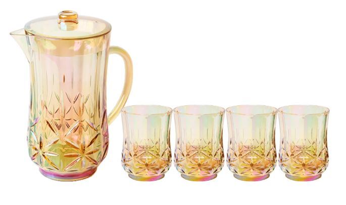 Includes full Classic Gold drinkware collection (2 pitchers, 4 short tumblers, 4 tall tumblers, 4 stemmed wine glasses, 4 champagne glasses, 4 martini glasses). No display included.