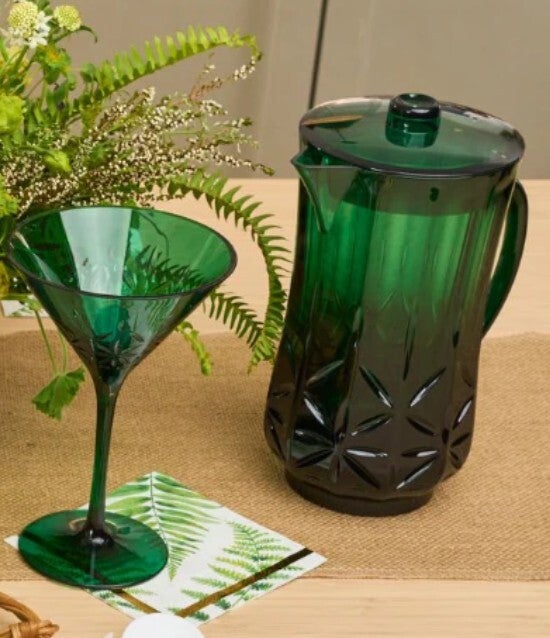 Includes full Classic Green drinkware collection (2 pitchers, 4 tall tumblers, 4 stemmed wine glasses, 4 champagne glasses, 4 martini glasses). No display included.