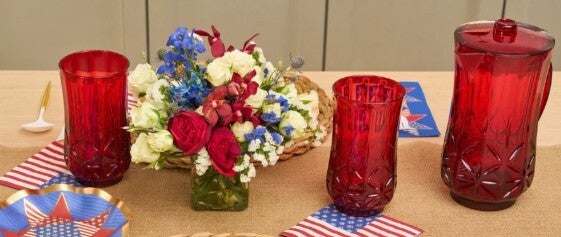 Includes full Classic Red drinkware collection (2 pitchers, 4 short tumblers, 4 tall tumblers, 4 stemmed wine glasses, 4 champagne glasses, 4 martini glasses). No display included.