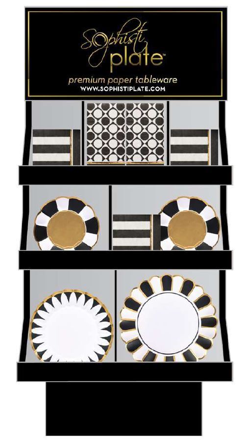 Includes full Cordoba paper collection (24 cocktail napkins, 12 guest napkins, 16 appetizer bowls, 8 salad plates, 12 dinner plates) and corrugated cardboard display. Display measures 51″ x 21.75″.