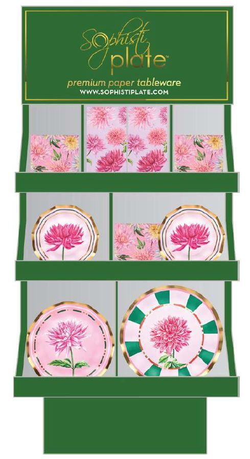 Includes full Dahlia Garden paper collection (24 cocktail napkins, 12 guest napkins, 16 appetizer bowls, 18 salad plates, 20 dinner plates) and corrugated cardboard display. Display measures 51″ x 21.75″.