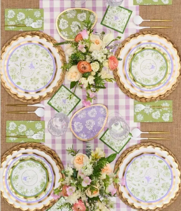 Includes full Easter Toile paper collection (12 cocktail napkins, 12 guest napkins, 12 die-cut salad plates, 12 salad plates, 12 dinner plates). No display included.