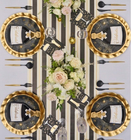 Includes full Gold Disco Coupe paper collection (12 cocktail napkins, 12 die-cut salad plates, 12 dinner plates). No display included.