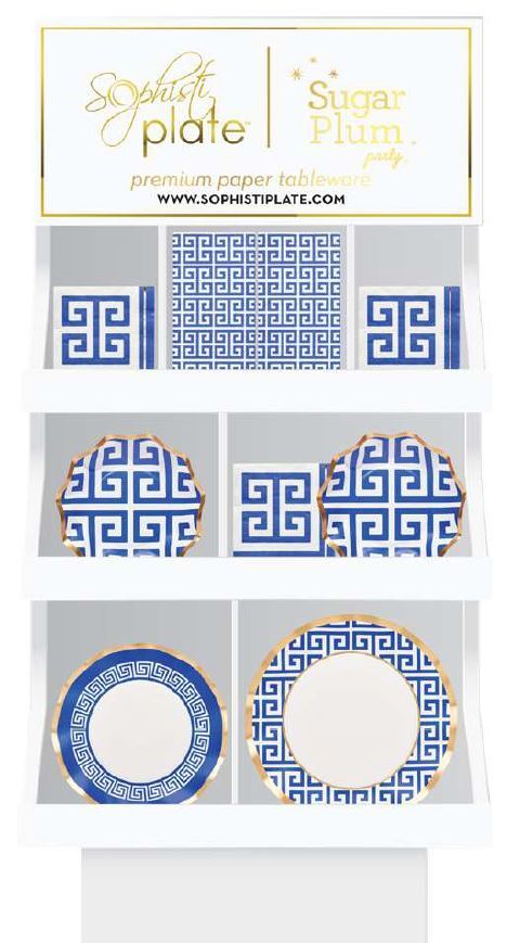 Includes full Greek Key paper collection (24 cocktail napkins, 12 guest napkins, 16 appetizer bowls, 18 salad plates, 20 dinner plates) and corrugated cardboard display. Display measures 51″ x 21.75″.