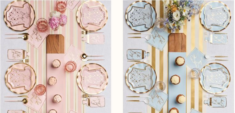Includes full Hey Baby paper collection in blue and pink (24 lunch napkins, 24 die-cut guest napkins, 24 die-cut plates). No display included.
