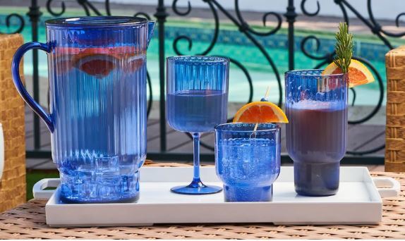 Includes full Modern Cobalt drinkware collection (4 short tumblers, 4 tall tumblers, 4 stemmed wine glasses, 4 champagne glasses, 4 martini glasses). No display included.