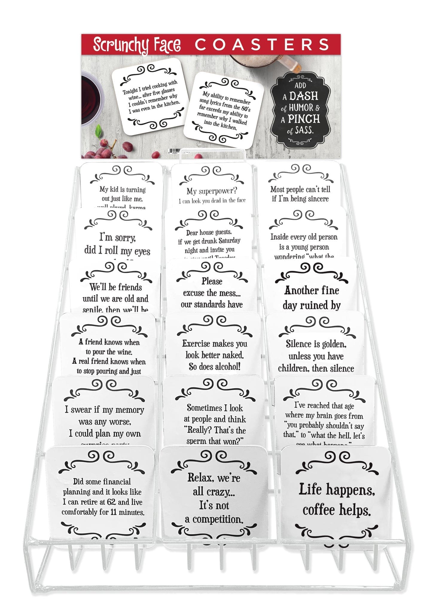 Scrunchy Face Coaster Best sellers prepack. Contains 18 designs x 6 pcs (108 Coasters) Display included. *Substitutions may apply