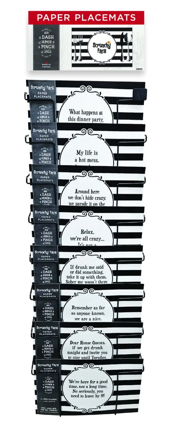 Scrunchy Face Placemat Prepack. Contains 8 designs x 6 pcs and display. Display offset of 6 placemats with purchase.