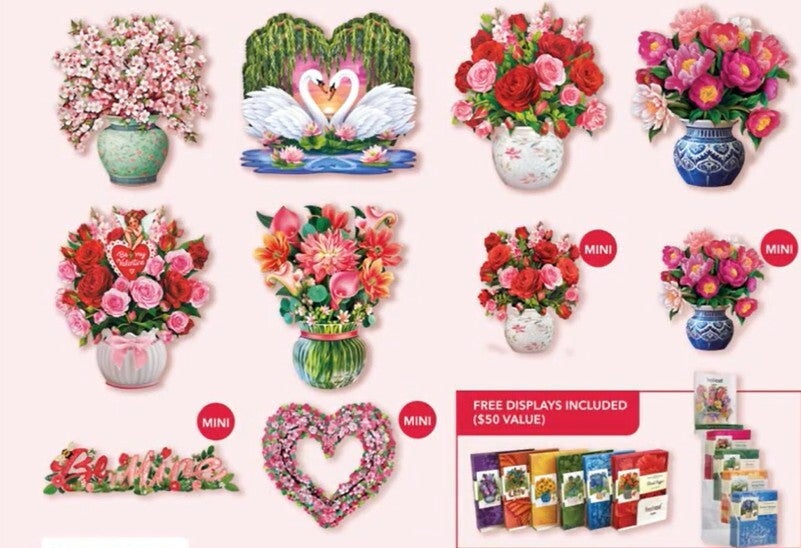 PREBOOK ONLY. Includes mix of Valentine’s Day themed classic and mini pop-up cards, 1 free acrylic 4-tier counter display, 1 free wood counter display, plus 1 free sample per card. No offset or substitutions. Orders must be placed by Nov 24th, 2025.