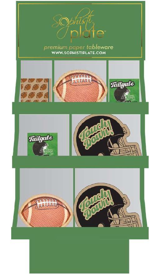 Includes full Tailgate paper collection (24 cocktail napkins, 12 guest napkins, 26 salad plates, 26 dinner plates) and corrugated cardboard display. Display measures 51″ x 21.75″.