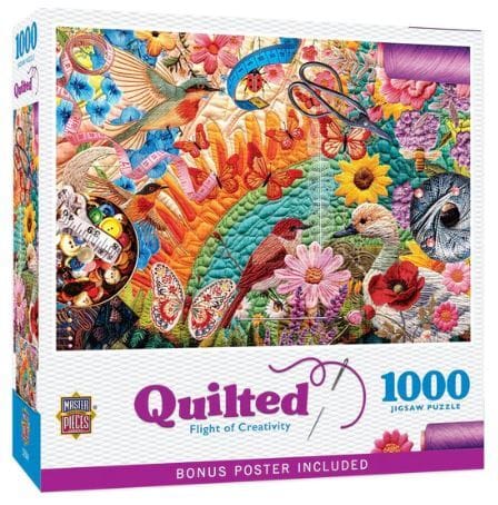 Dive into the joy of crafting as you piece together this lively scene featuring a quilter’s table adorned with an array of tools and a kaleidoscope of colorful threads.