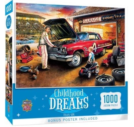 With tools scattered, the boy, dreaming of the track, pushes his toy car alongside the roaring #4 car as the crowd cheers in the background.