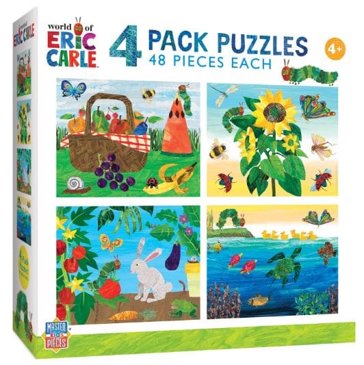 Each puzzle consists of 48 pieces, measures 10″ x 8″, and depicts a unique scene from “The Very Hungry Caterpillar”. Crafted from recycled puzzle board, perfect for children ages 4 and up.
