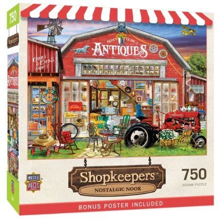Step back in time with Nostalgic Nook, a captivating 750-piece puzzle that transports you to a charming antique shop set inside a rustic barn.