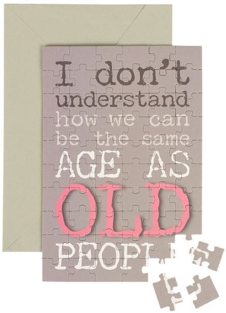 60pc puzzle card includes a humorous age-themed sentiment on the front in a fun retro style, with a blank space on the back to write a personal message. Due to the shape and weight, extra postage is required when mailing puzzle cards.