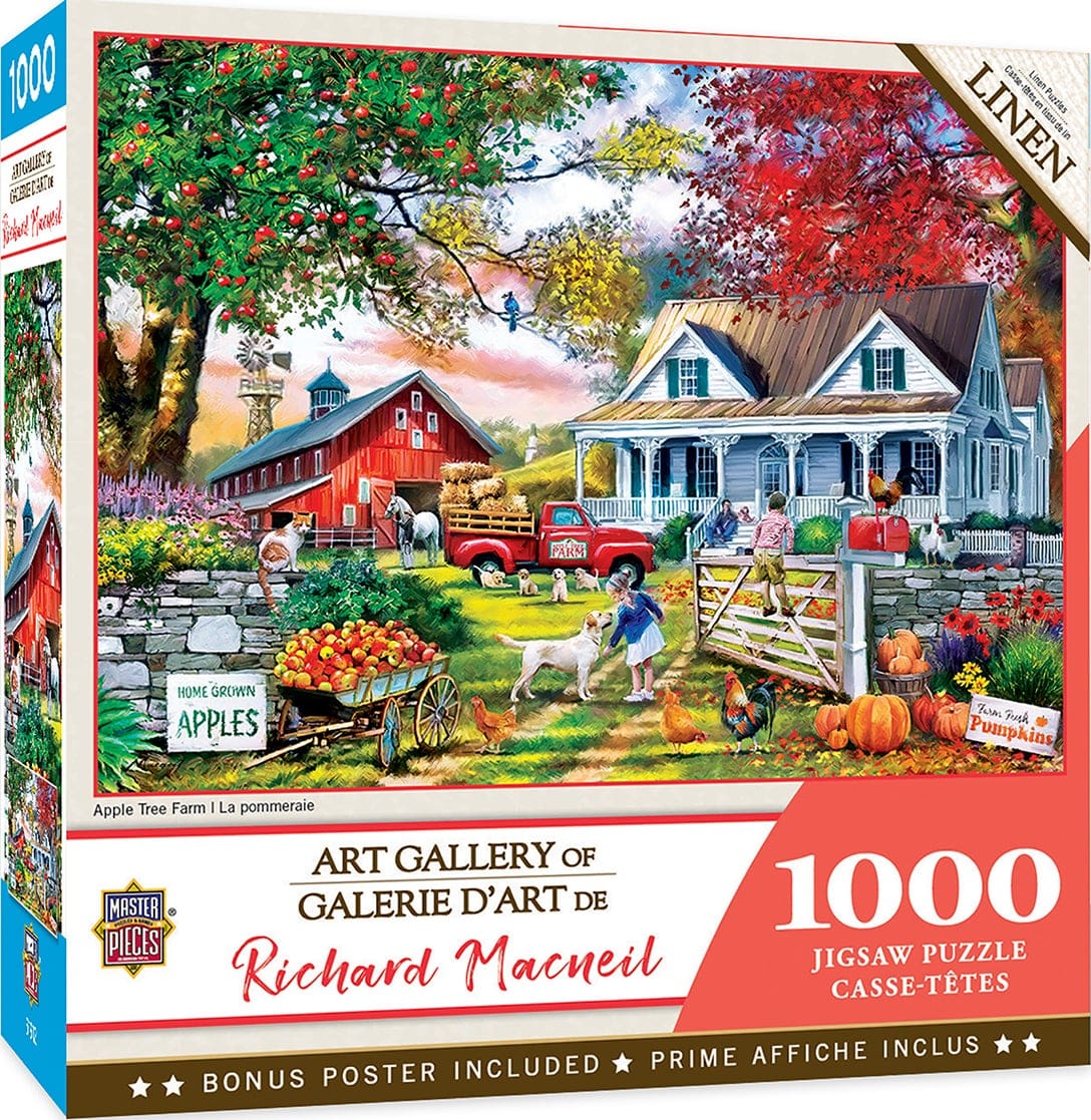 19.25″ x 26.75″ 1000pc Richard McNeil puzzles. Apples are in season and everyone helps the harvest. Made of recycled material.