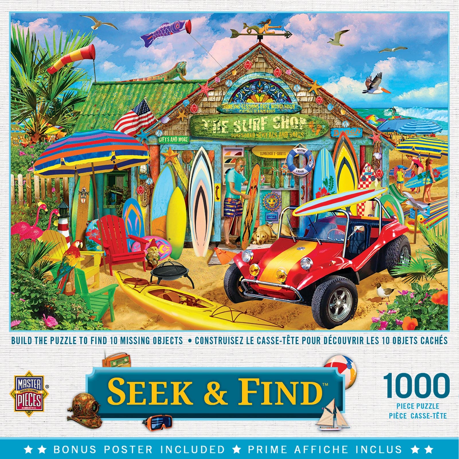 19.25″ x 26.75″ 1000pc Hidden Objects puzzles- This Beach Side collection of bits and bobs is filled with surprises. Made from linen/recycled materials.