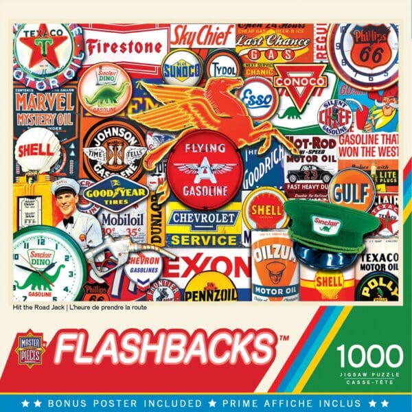 19.25″ x 26.75″ 1000pc Flashbacks puzzles has a nostalgic feeling of different thinks that take you back to your childhood days. Made from linen/recycled materials.