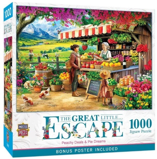 At a bustling roadside market shaded by a striped awning, crates overflow with farm-fresh produce, blooming flowers, and homemade pies that practically smell like sunshine. Measures 19.25″ x 26.75″.