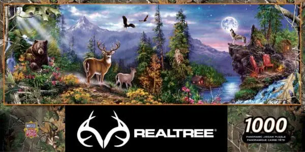 Realtree 13″ x 39″ 1,000pc Panoramic puzzles features a scenic at a glance outdoor view of the forest and all it’s beauty with the animals that live there. Made of recycled materials